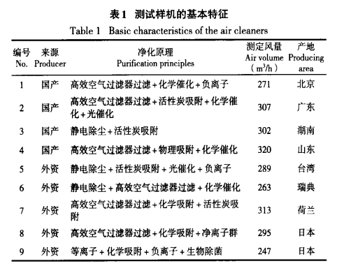 通過市場(chǎng)調(diào)研機(jī)專家訪問,本次測(cè)試實(shí)驗(yàn)共選取市場(chǎng)上9種具有代表性的室內(nèi)空氣凈化品牌(4種國(guó)產(chǎn)品牌,5種外資企業(yè)產(chǎn)品)各1臺(tái)樣機(jī)進(jìn)行檢測(cè)。樣機(jī)的基本特征見表1。