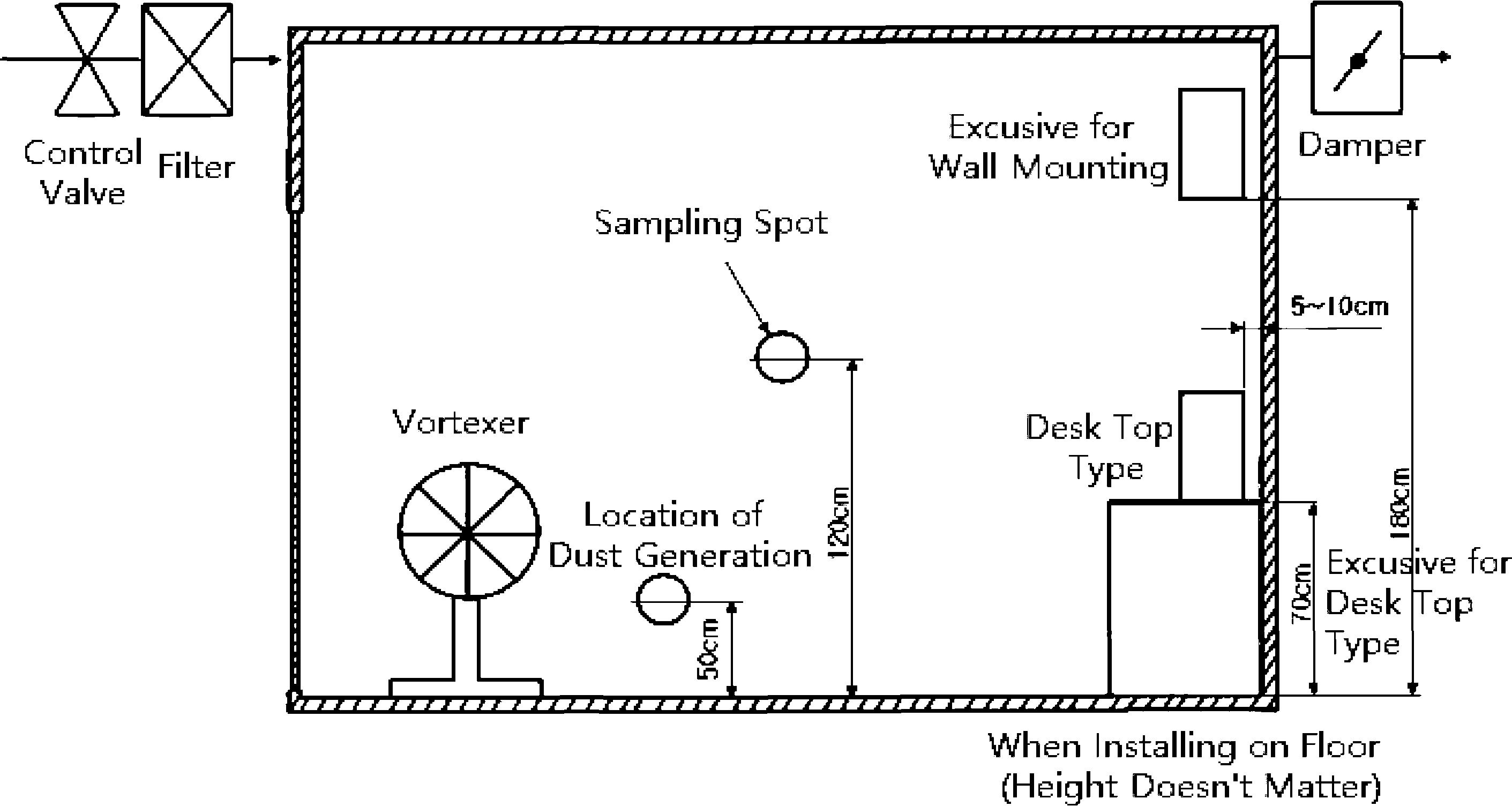 在試驗室中,應以試驗顆粒均勻的方式安裝顆粒發(fā)生器和渦流器。短時間內(nèi)濃度的空間分布。測量時,顆粒的初始濃度試驗室內(nèi)應為1?3 x 108計數(shù)/m3。