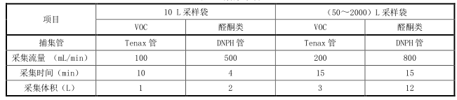 1.8準(zhǔn)確充入 50%的高純氮?dú)?,?65 ℃加熱 2 h±10 min,用 TENAX 管捕集苯類物質(zhì),用 DNPH 管捕集醛類物質(zhì),捕集條件見表。