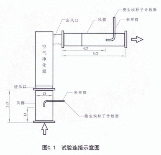 4.1、空氣凈化器置于試驗室內(nèi)并在其進(jìn)風(fēng)口與出風(fēng)口連接如圖C.1所示的短管,用污染源發(fā)生裝置散發(fā)污染物。接塵埃粒子計數(shù)器等采樣器到采樣管。