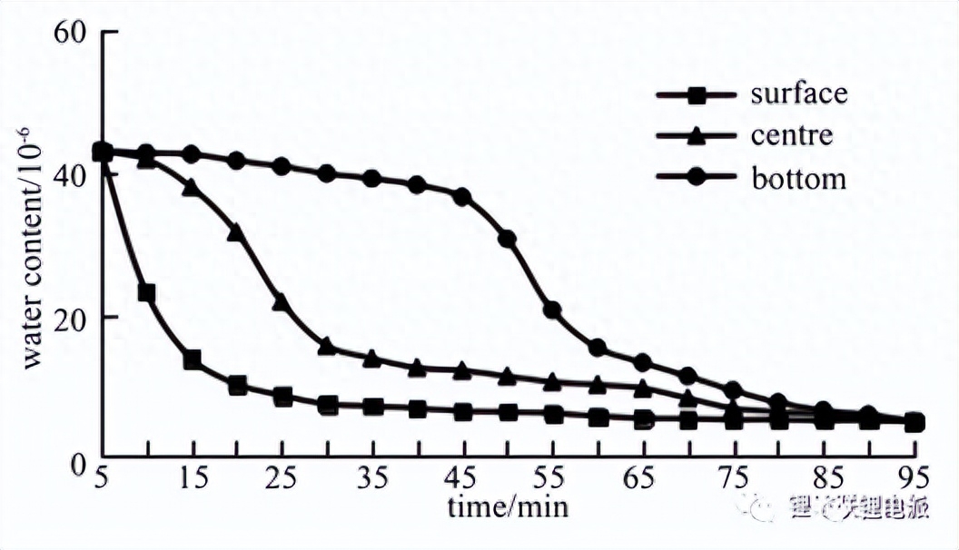通過(guò)烘烤發(fā)現(xiàn),在烘烤開(kāi)始時(shí),電芯表面水分蒸發(fā)速率便很快,之后含水量慢慢減少趨于平緩,電芯中間部分在烘烤開(kāi)始20 min左右蒸發(fā)速度達(dá)到最大值,而電芯底部在烘烤開(kāi)始時(shí)水分蒸發(fā)并不明顯,在烘烤50 min左右水分含量降低最為明顯。