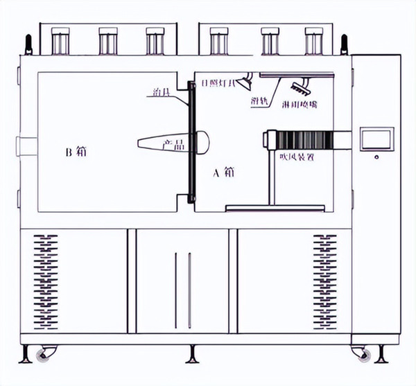 各個(gè)汽車廠商制定的兩箱法起霧試驗(yàn)標(biāo)準(zhǔn)的要求有所差異,其用到的測(cè)試設(shè)備也會(huì)有所差異,典型的汽車頭燈兩腔起霧箱的正面外觀和內(nèi)部結(jié)構(gòu)的示意圖分別如下圖所示。