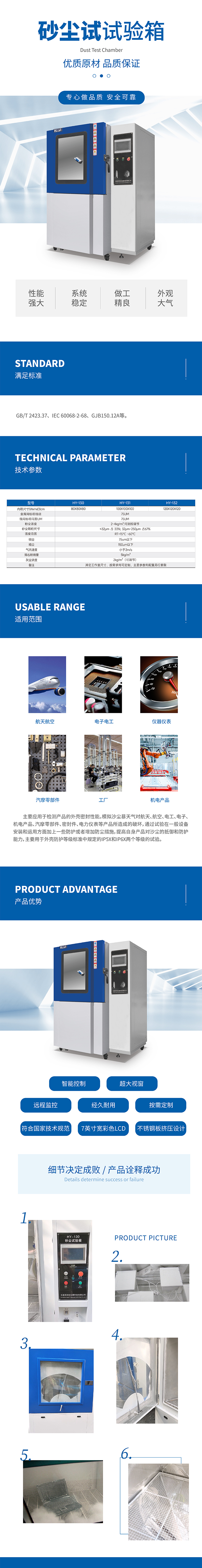砂塵試驗(yàn)箱采用人工模擬砂塵環(huán)境,來檢驗(yàn)試品對(duì)防塵能力的試驗(yàn)設(shè)備。
