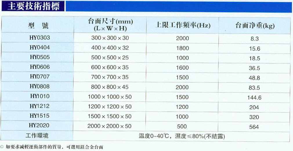 上限工作頻率(Hz) | 臺面凈重(kg) |