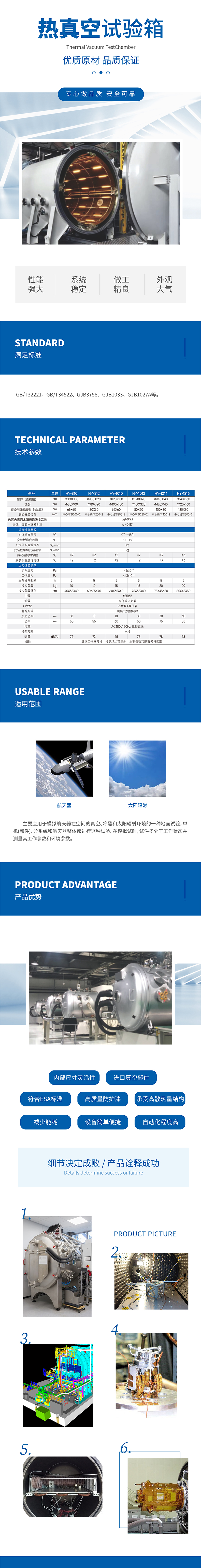 產(chǎn)品簡(jiǎn)介: 熱真空試驗(yàn)艙由真空容器、熱沉、真空泵組、冷卻系統(tǒng)、加熱系統(tǒng)、控制及數(shù)據(jù)采集系統(tǒng)及其他特殊需求的機(jī)構(gòu)組成。訂購(gòu)熱線:0769-83482055